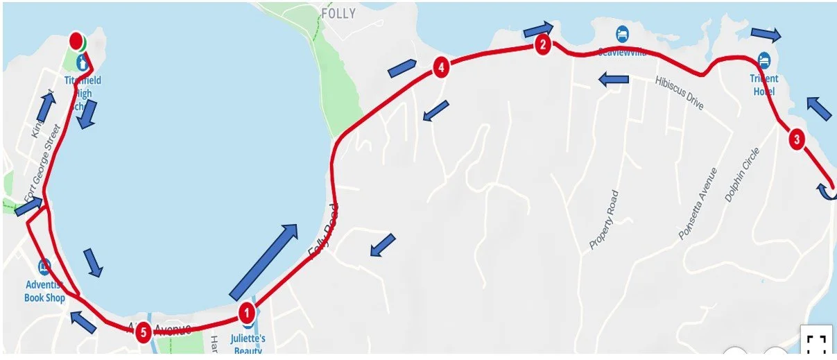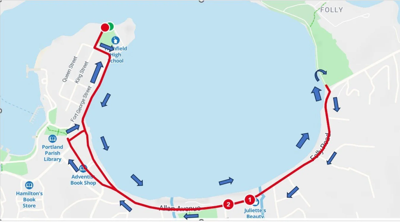 The Route starts with one lap around the track at Titchfield. then process through the front gate, turn Left unto Foreshore Road, continue to Folly Gate. Turn around and follow the same path on Allan Ave then vere Left at Piggy’s Jerk Centre unto Harbour Street. Turn Right unto Gideon Ave then Left unto Foreshore road and continue to Titchfield.